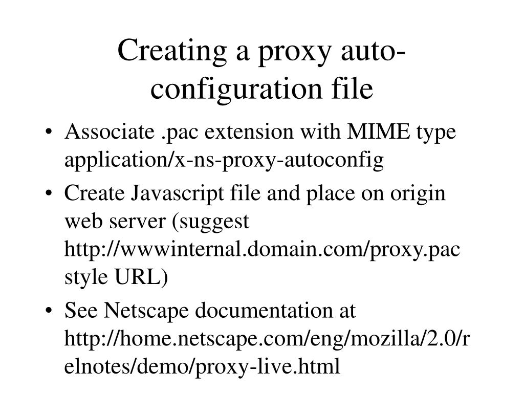 Creating a proxy auto-configuration file • Associate .pac extension with MIME type application/x-ns-proxy-autoconfig • Create Javascript file and place on origin web server (suggest http://wwwinternal.domain.com/proxy.pac style URL) • See Netscape documentation at http://home.netscape.com/eng/mozilla/2.0/relnotes/demo/proxy-live.html