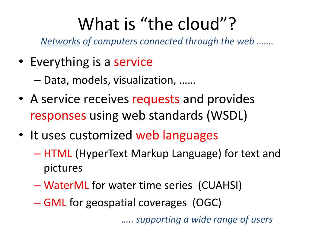 What is “the cloud”?Networks of computers connected through the web ……. • Everything is a service • Data, models, visualization, …… • A service receives requests and provides responses using web standards (WSDL) • It uses customized web languages • HTML (HyperText Markup Language) for text and pictures • WaterML for water time series (CUAHSI) • GML for geospatial coverages (OGC) ….. supporting a wide range of users