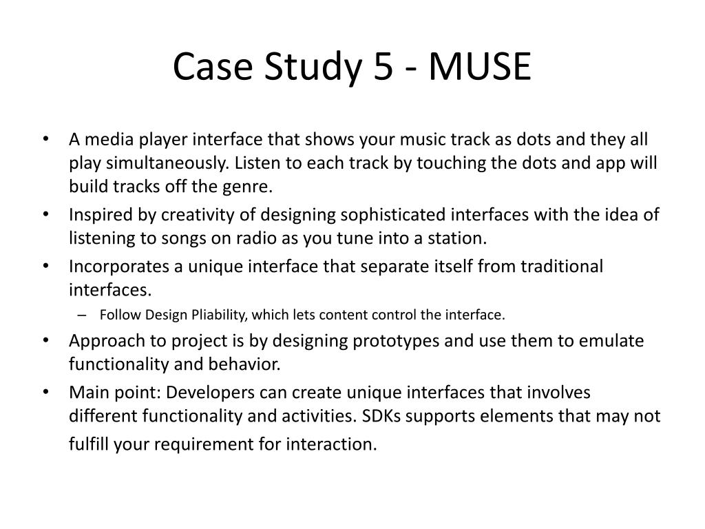Case Study 5 - MUSE • A media player interface that shows your music track as dots and they all play simultaneously. Listen to each track by touching the dots and app will build tracks off the genre. • Inspired by creativity of designing sophisticated interfaces with the idea of listening to songs on radio as you tune into a station. • Incorporates a unique interface that separate itself from traditional interfaces. • Follow Design Pliability, which lets content control the interface. • Approach to project is by designing prototypes and use them to emulate functionality and behavior. • Main point: Developers can create unique interfaces that involves different functionality and activities. SDKs supports elements that may not fulfill your requirement for interaction.