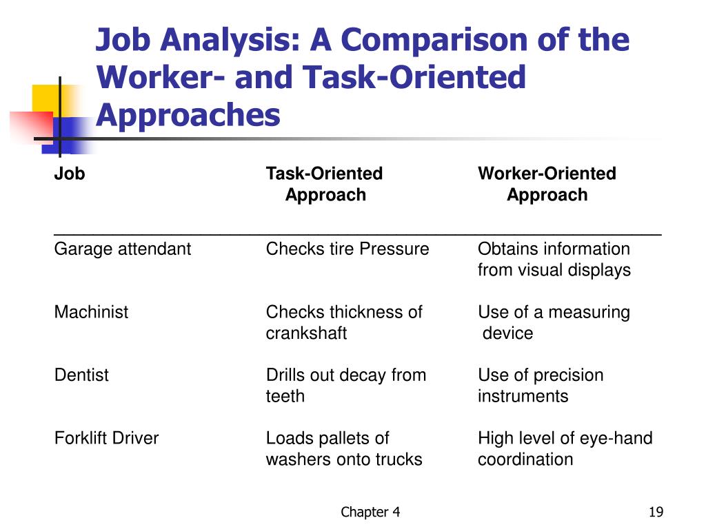 Job Analysis Two approaches to Job Analysis: • Worker-Oriented Approach • Focuses on the KSAs that are required on the job • Task-Oriented Approach • Focuses on the work activities (tasks) required to perform the job Chapter 4