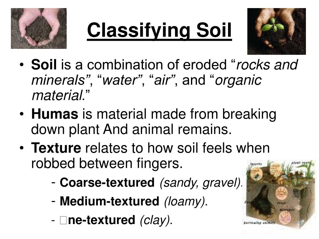Classifying Soil • Soil is a combination of eroded “rocks and minerals”, “water”, “air”, and “organic material.” • Humas is material made from breaking down plant And animal remains. • Texture relates to how soil feels when robbed between fingers. - Coarse-textured(sandy, gravel). - Medium-textured(loamy). - ne-textured(clay).