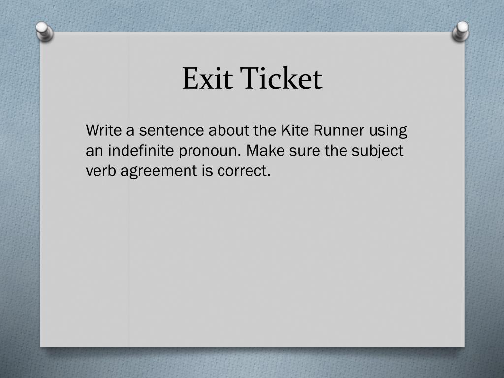 Exit Ticket Write a sentence about the Kite Runner using an indefinite pronoun. Make sure the subject verb agreement is correct.