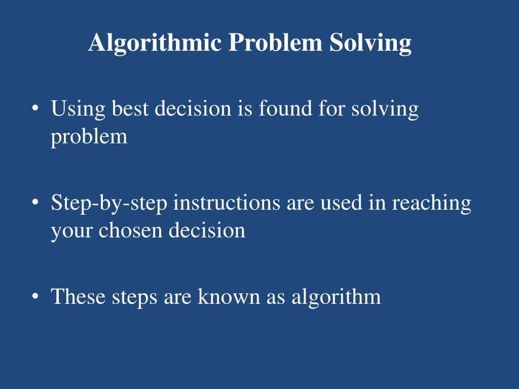 Algorithmic Problem Solving • Using best decision is found for solving problem • Step-by-step instructions are used in reaching your chosen decision • These steps are known as algorithm