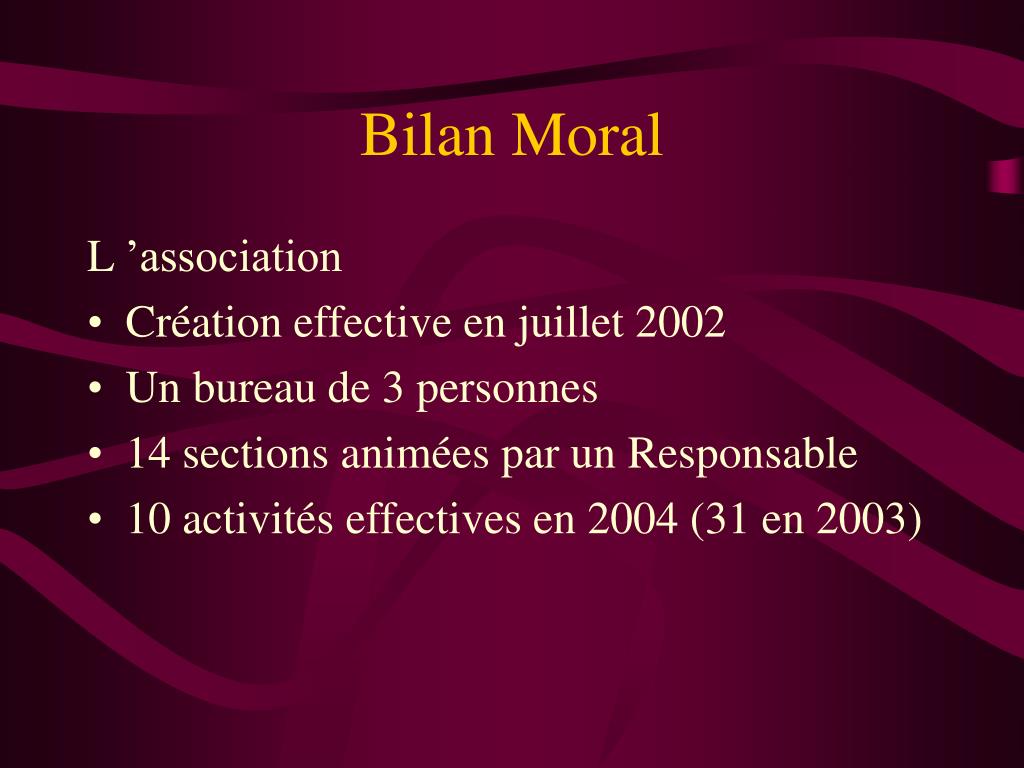Bilan Moral L ’association • Création effective en juillet 2002 • Un bureau de 3 personnes • 14 sections animées par un Responsable • 10 activités effectives en 2004 (31 en 2003)