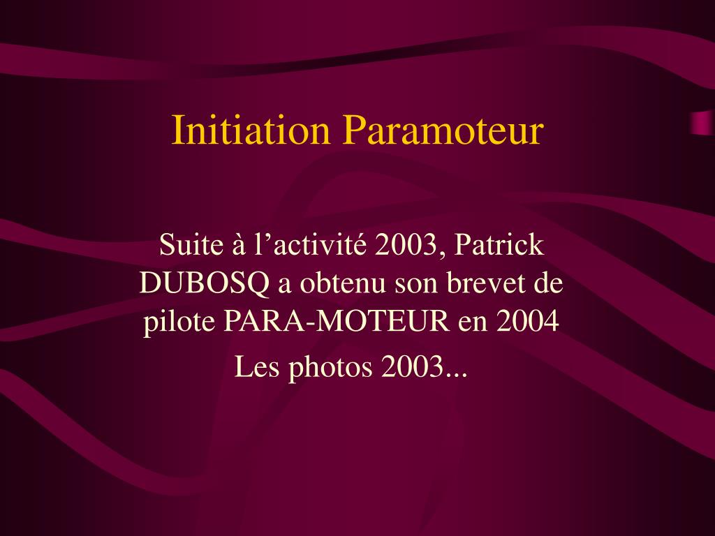 Initiation Paramoteur Suite à l’activité 2003, Patrick DUBOSQ a obtenu son brevet de pilote PARA-MOTEUR en 2004 Les photos 2003...