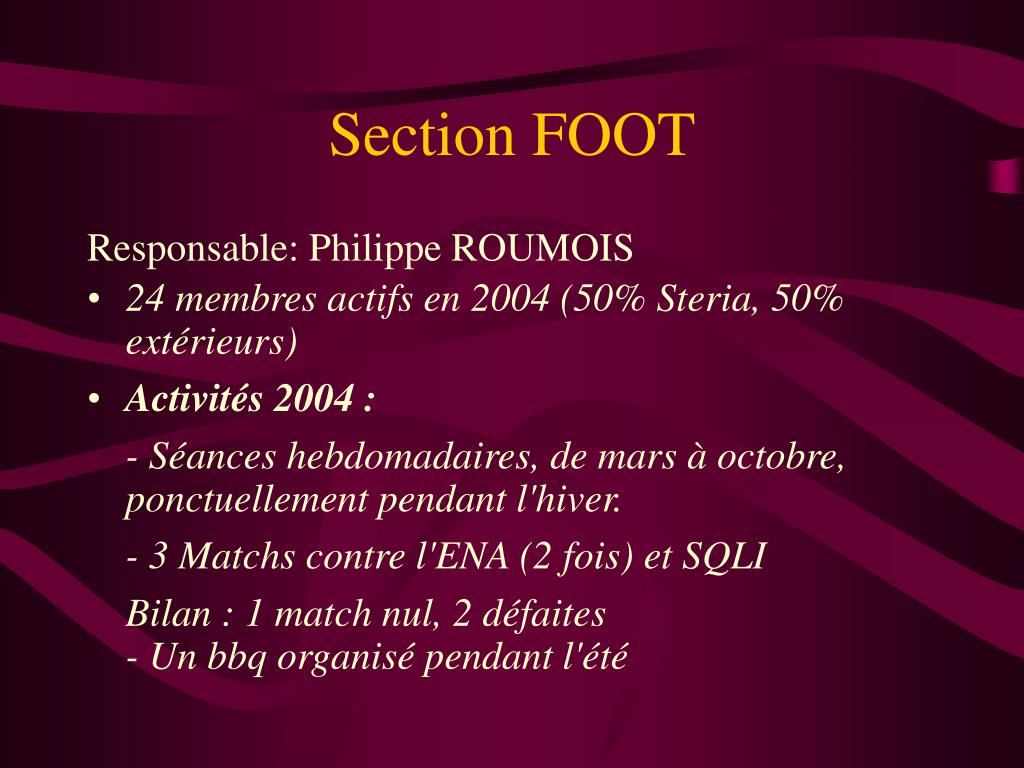 Section FOOT Responsable: Philippe ROUMOIS • 24 membres actifs en 2004 (50% Steria, 50% extérieurs) • Activités 2004 : - Séances hebdomadaires, de mars à octobre, ponctuellement pendant l'hiver. - 3 Matchs contre l'ENA (2 fois) et SQLI Bilan : 1 match nul, 2 défaites- Un bbq organisé pendant l'été