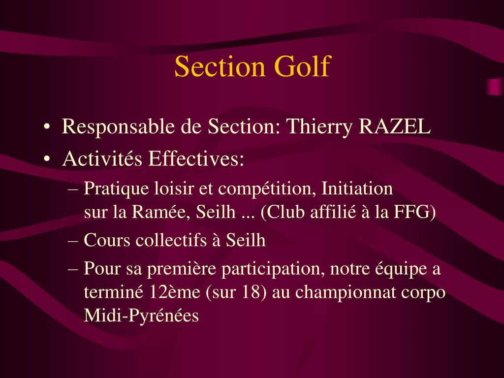 Section Golf • Responsable de Section: Thierry RAZEL • Activités Effectives: • Pratique loisir et compétition, Initiationsur la Ramée, Seilh ... (Club affilié à la FFG) • Cours collectifs à Seilh • Pour sa première participation, notre équipe a terminé 12ème (sur 18) au championnat corpo Midi-Pyrénées