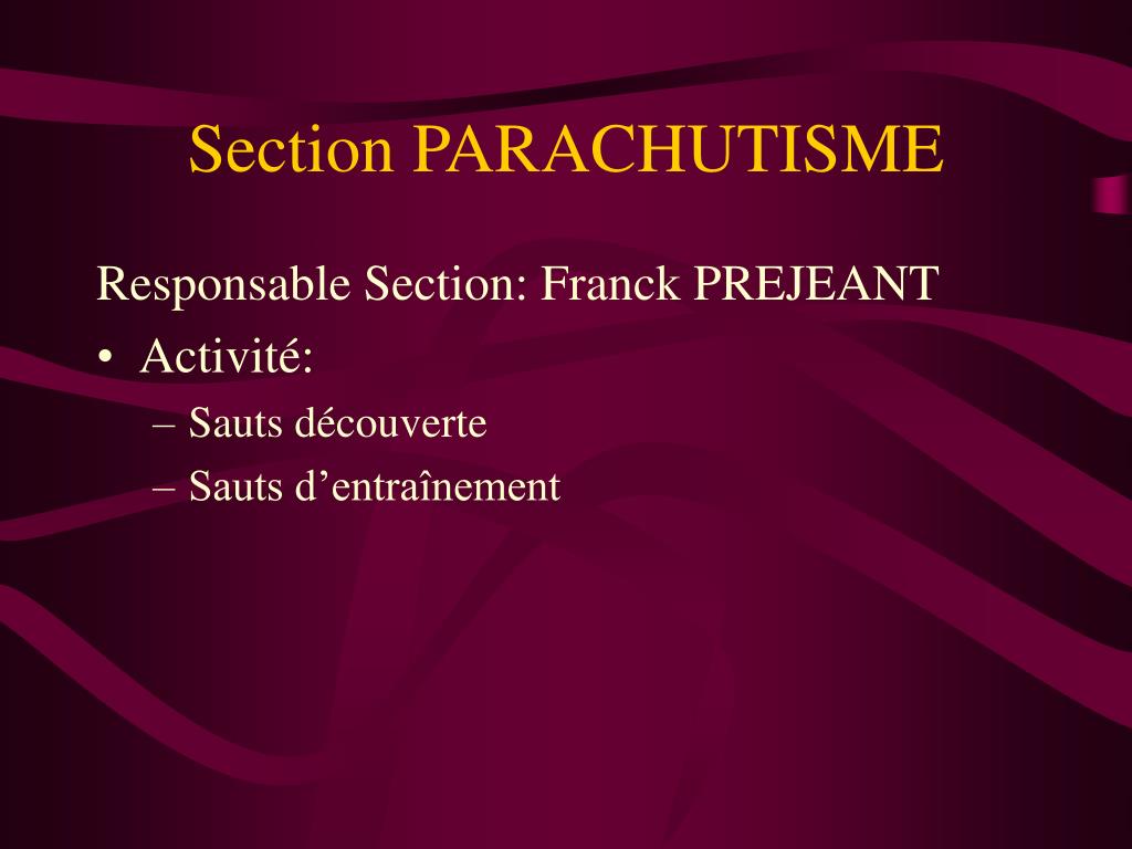Section PARACHUTISME Responsable Section: Franck PREJEANT • Activité: • Sauts découverte • Sauts d’entraînement