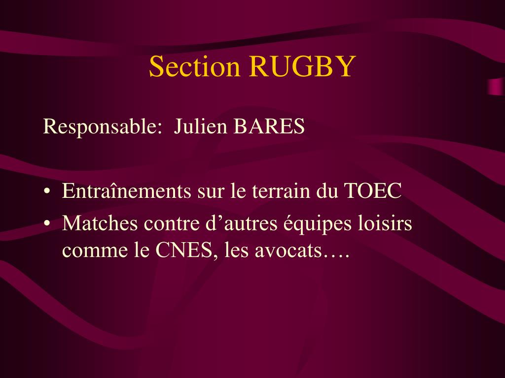 Section RUGBY Responsable: Julien BARES • Entraînements sur le terrain du TOEC • Matches contre d’autres équipes loisirs comme le CNES, les avocats….