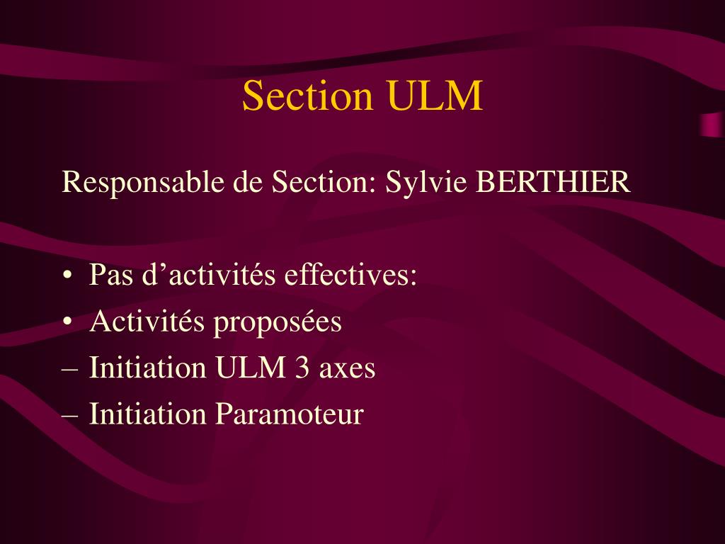 Section ULM Responsable de Section: Sylvie BERTHIER • Pas d’activités effectives: • Activités proposées • Initiation ULM 3 axes • Initiation Paramoteur