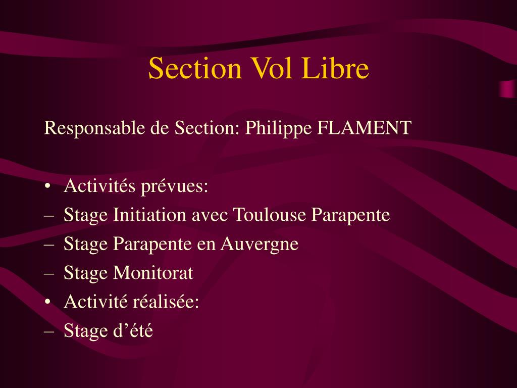 Section Vol Libre Responsable de Section: Philippe FLAMENT • Activités prévues: • Stage Initiation avec Toulouse Parapente • Stage Parapente en Auvergne • Stage Monitorat • Activité réalisée: • Stage d’été