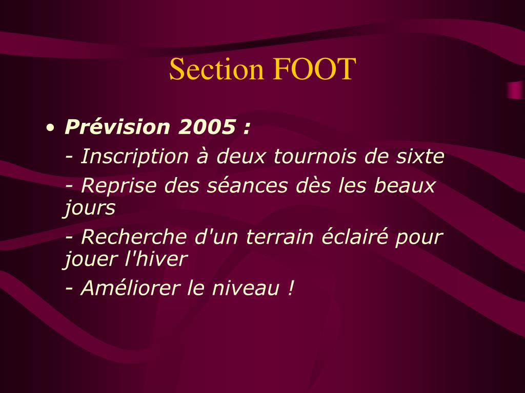 Section FOOT • Prévision 2005 : • - Inscription à deux tournois de sixte • - Reprise des séances dès les beaux jours • - Recherche d'un terrain éclairé pour jouer l'hiver • - Améliorer le niveau !