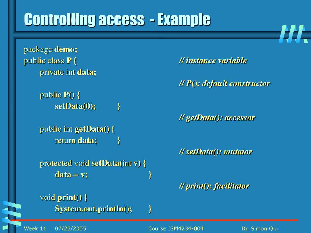 Controlling access - Example package demo; public class P { // instance variable private int data; // P(): default constructor public P() { setData(0); } // getData(): accessor public int getData() { return data; } // setData(): mutator protected void setData(int v) { data = v; } // print(): facilitator void print() { System.out.println(); }