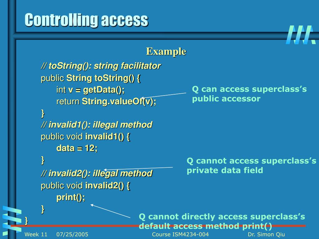 Controlling access Example // toString(): string facilitator public String toString() { int v = getData(); return String.valueOf(v); } // invalid1(): illegal method publicvoid invalid1() { data = 12; } // invalid2(): illegal method publicvoid invalid2() { print(); } } Q can access superclass’spublic accessor Q cannot access superclass’sprivate data field Q cannot directly access superclass’s default access method print()