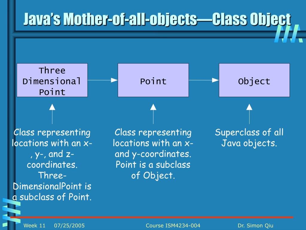 Three Dimensional Point Object Point Class representing Class representing Superclass of all locations with an x- locations with an x- Java objects. , y-, and z- and y-coordinates. coordinates. Point is a subclass Three- of Object. DimensionalPoint is a subclass of Point. Java’s Mother-of-all-objects—Class Object