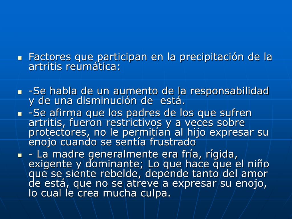 Factores que participan en la precipitación de la artritis reumática: -Se habla de un aumento de la responsabilidad y de una disminución de está. -Se afirma que los padres de los que sufren artritis, fueron restrictivos y a veces sobre protectores, no le permitían al hijo expresar su enojo cuando se sentía frustrado - La madre generalmente era fría, rígida, exigente y dominante; Lo que hace que el niño que se siente rebelde, depende tanto del amor de está, que no se atreve a expresar su enojo, lo cual le crea mucha culpa.