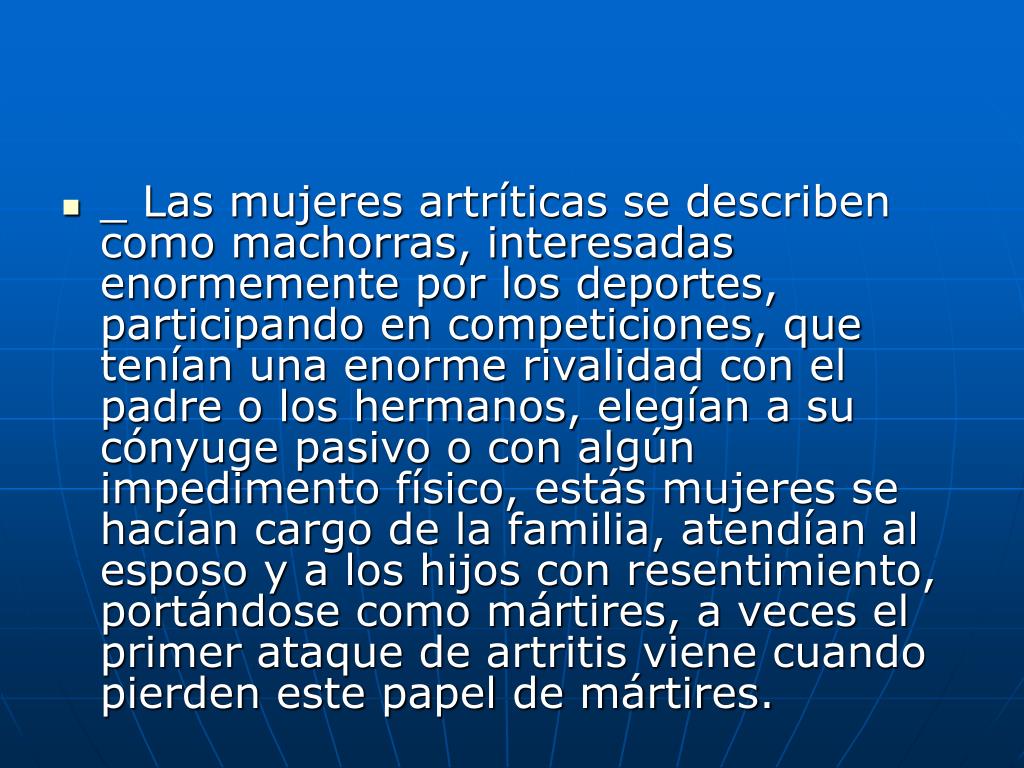 _ Las mujeres artríticas se describen como machorras, interesadas enormemente por los deportes, participando en competiciones, que tenían una enorme rivalidad con el padre o los hermanos, elegían a su cónyuge pasivo o con algún impedimento físico, estás mujeres se hacían cargo de la familia, atendían al esposo y a los hijos con resentimiento, portándose como mártires, a veces el primer ataque de artritis viene cuando pierden este papel de mártires.