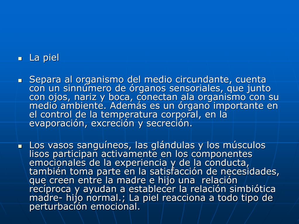 La piel Separa al organismo del medio circundante, cuenta con un sinnúmero de órganos sensoriales, que junto con ojos, nariz y boca, conectan ala organismo con su medio ambiente. Además es un órgano importante en el control de la temperatura corporal, en la evaporación, excreción y secreción. Los vasos sanguíneos, las glándulas y los músculos lisos participan activamente en los componentes emocionales de la experiencia y de la conducta, también toma parte en la satisfacción de necesidades, que creen entre la madre e hijo una relación recíproca y ayudan a establecer la relación simbiótica madre- hijo normal.; La piel reacciona a todo tipo de perturbación emocional.