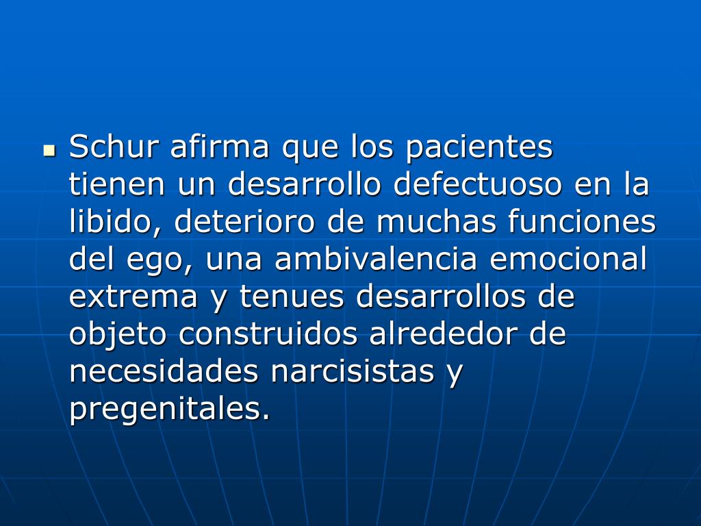 Schur afirma que los pacientes tienen un desarrollo defectuoso en la libido, deterioro de muchas funciones del ego, una ambivalencia emocional extrema y tenues desarrollos de objeto construidos alrededor de necesidades narcisistas y pregenitales.