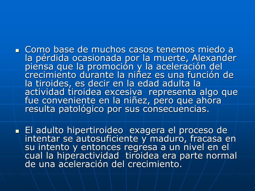 Como base de muchos casos tenemos miedo a la pérdida ocasionada por la muerte, Alexander piensa que la promoción y la aceleración del crecimiento durante la niñez es una función de la tiroides, es decir en la edad adulta la actividad tiroidea excesiva representa algo que fue conveniente en la niñez, pero que ahora resulta patológico por sus consecuencias. El adulto hipertiroideo exagera el proceso de intentar se autosuficiente y maduro, fracasa en su intento y entonces regresa a un nivel en el cual la hiperactividad tiroidea era parte normal de una aceleración del crecimiento.