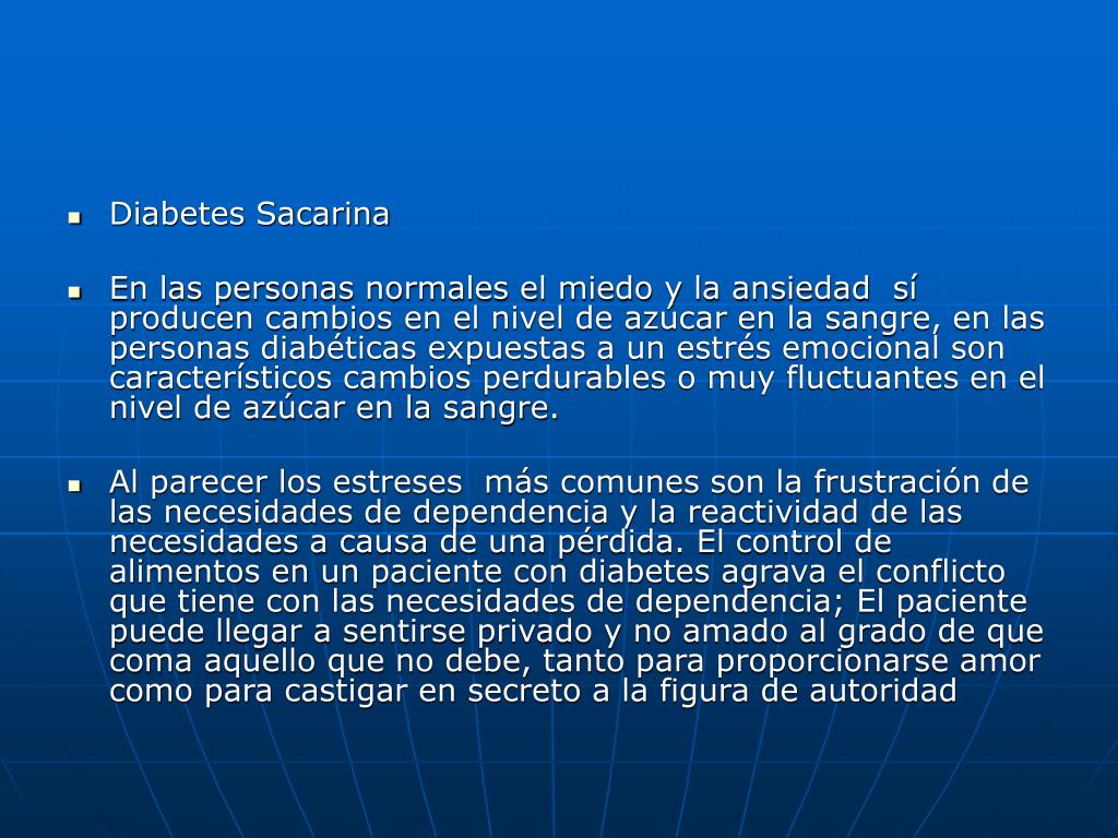 Diabetes Sacarina En las personas normales el miedo y la ansiedad sí producen cambios en el nivel de azúcar en la sangre, en las personas diabéticas expuestas a un estrés emocional son característicos cambios perdurables o muy fluctuantes en el nivel de azúcar en la sangre. Al parecer los estreses más comunes son la frustración de las necesidades de dependencia y la reactividad de las necesidades a causa de una pérdida. El control de alimentos en un paciente con diabetes agrava el conflicto que tiene con las necesidades de dependencia; El paciente puede llegar a sentirse privado y no amado al grado de que coma aquello que no debe, tanto para proporcionarse amor como para castigar en secreto a la figura de autoridad