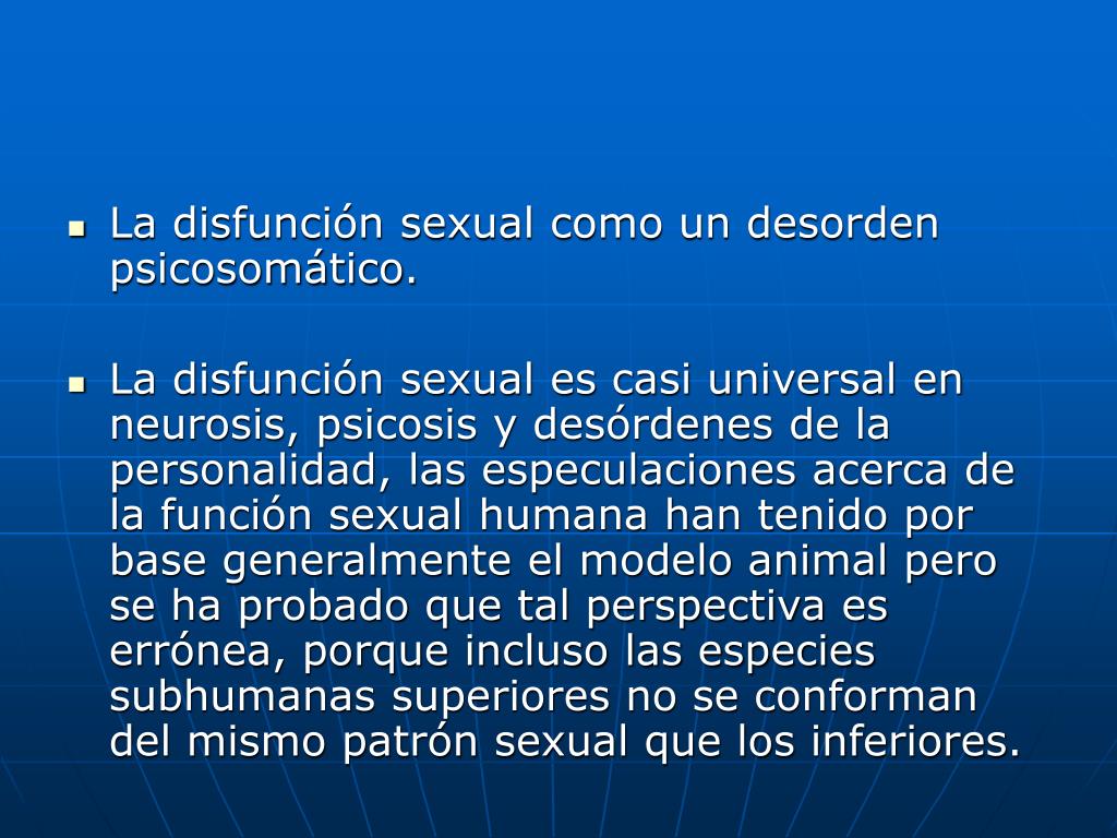 La disfunción sexual como un desorden psicosomático. La disfunción sexual es casi universal en neurosis, psicosis y desórdenes de la personalidad, las especulaciones acerca de la función sexual humana han tenido por base generalmente el modelo animal pero se ha probado que tal perspectiva es errónea, porque incluso las especies subhumanas superiores no se conforman del mismo patrón sexual que los inferiores.