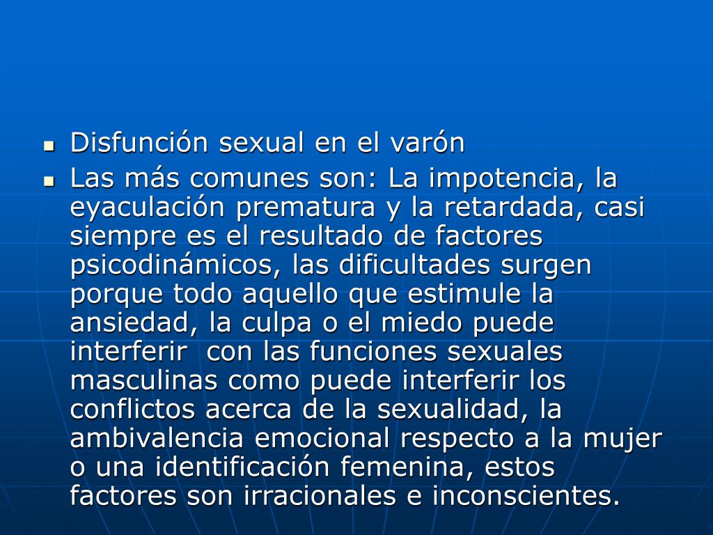 Disfunción sexual en el varón Las más comunes son: La impotencia, la eyaculación prematura y la retardada, casi siempre es el resultado de factores psicodinámicos, las dificultades surgen porque todo aquello que estimule la ansiedad, la culpa o el miedo puede interferir con las funciones sexuales masculinas como puede interferir los conflictos acerca de la sexualidad, la ambivalencia emocional respecto a la mujer o una identificación femenina, estos factores son irracionales e inconscientes.