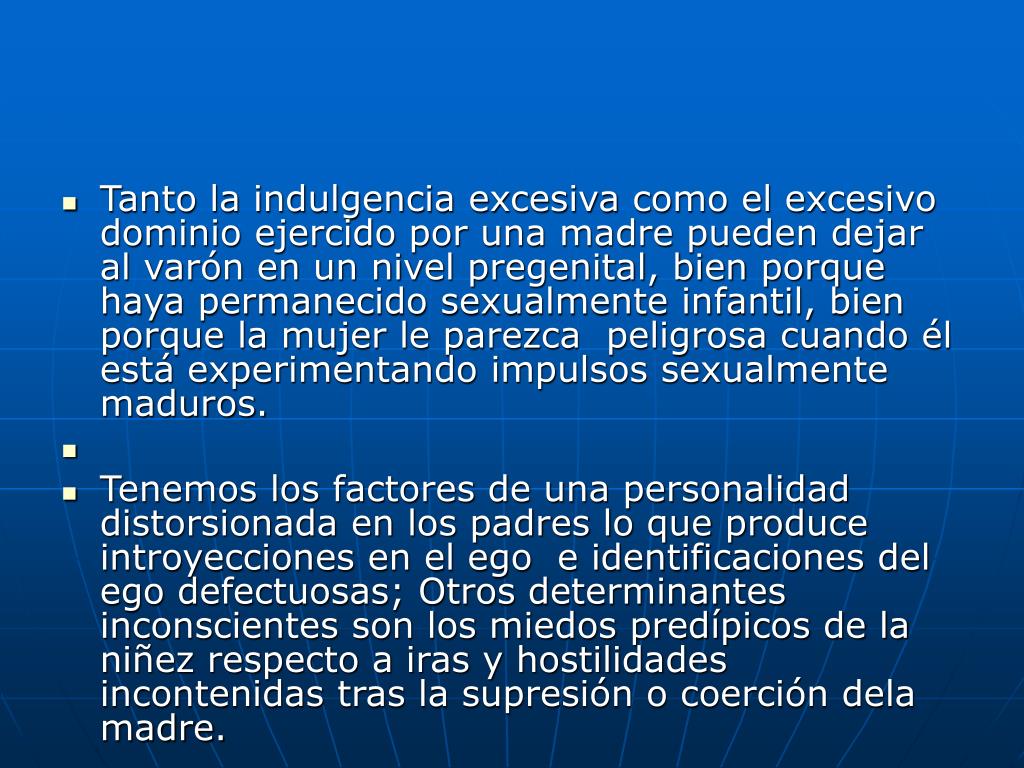 Tanto la indulgencia excesiva como el excesivo dominio ejercido por una madre pueden dejar al varón en un nivel pregenital, bien porque haya permanecido sexualmente infantil, bien porque la mujer le parezca peligrosa cuando él está experimentando impulsos sexualmente maduros. Tenemos los factores de una personalidad distorsionada en los padres lo que produce introyecciones en el ego e identificaciones del ego defectuosas; Otros determinantes inconscientes son los miedos predípicos de la niñez respecto a iras y hostilidades incontenidas tras la supresión o coerción dela madre.