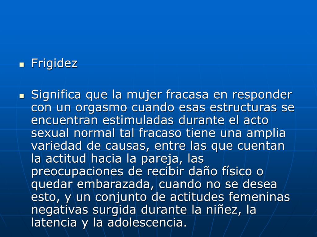 Frigidez Significa que la mujer fracasa en responder con un orgasmo cuando esas estructuras se encuentran estimuladas durante el acto sexual normal tal fracaso tiene una amplia variedad de causas, entre las que cuentan la actitud hacia la pareja, las preocupaciones de recibir daño físico o quedar embarazada, cuando no se desea esto, y un conjunto de actitudes femeninas negativas surgida durante la niñez, la latencia y la adolescencia.