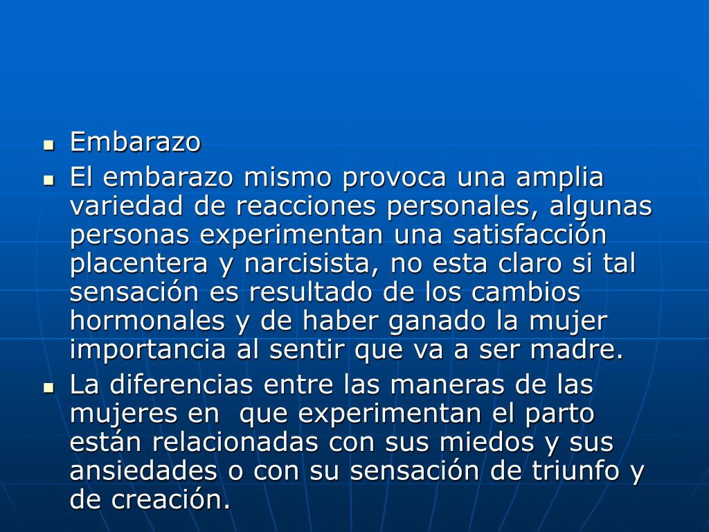 Embarazo El embarazo mismo provoca una amplia variedad de reacciones personales, algunas personas experimentan una satisfacción placentera y narcisista, no esta claro si tal sensación es resultado de los cambios hormonales y de haber ganado la mujer importancia al sentir que va a ser madre. La diferencias entre las maneras de las mujeres en que experimentan el parto están relacionadas con sus miedos y sus ansiedades o con su sensación de triunfo y de creación.