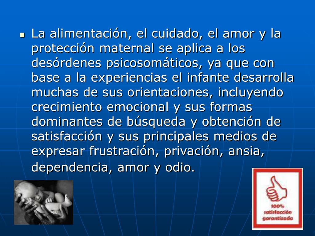 La alimentación, el cuidado, el amor y la protección maternal se aplica a los desórdenes psicosomáticos, ya que con base a la experiencias el infante desarrolla muchas de sus orientaciones, incluyendo crecimiento emocional y sus formas dominantes de búsqueda y obtención de satisfacción y sus principales medios de expresar frustración, privación, ansia, dependencia, amor y odio.