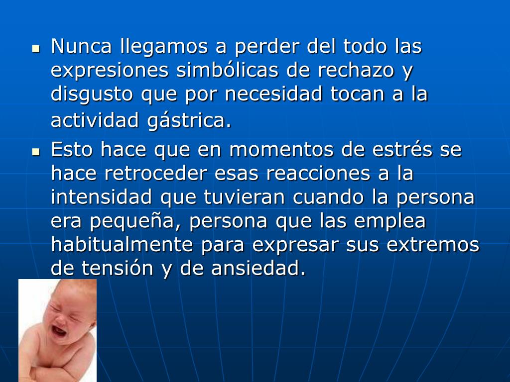 Nunca llegamos a perder del todo las expresiones simbólicas de rechazo y disgusto que por necesidad tocan a la actividad gástrica. • Esto hace que en momentos de estrés se hace retroceder esas reacciones a la intensidad que tuvieran cuando la persona era pequeña, persona que las emplea habitualmente para expresar sus extremos de tensión y de ansiedad.