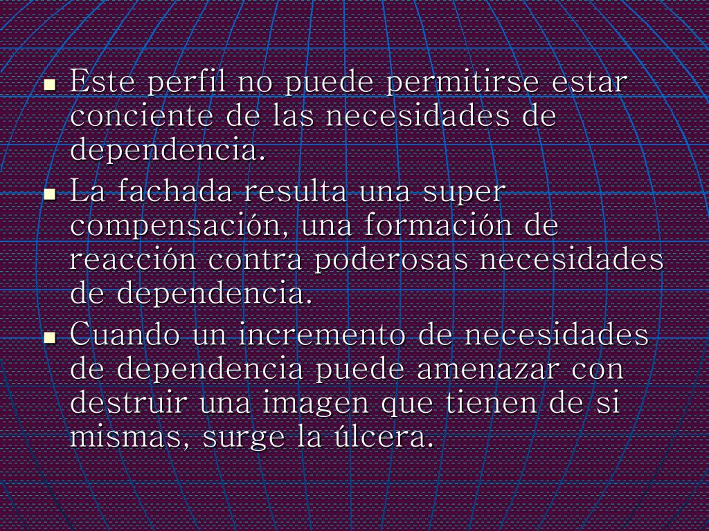 Este perfil no puede permitirse estar conciente de las necesidades de dependencia. • La fachada resulta una super compensación, una formación de reacción contra poderosas necesidades de dependencia. • Cuando un incremento de necesidades de dependencia puede amenazar con destruir una imagen que tienen de si mismas, surge la úlcera.