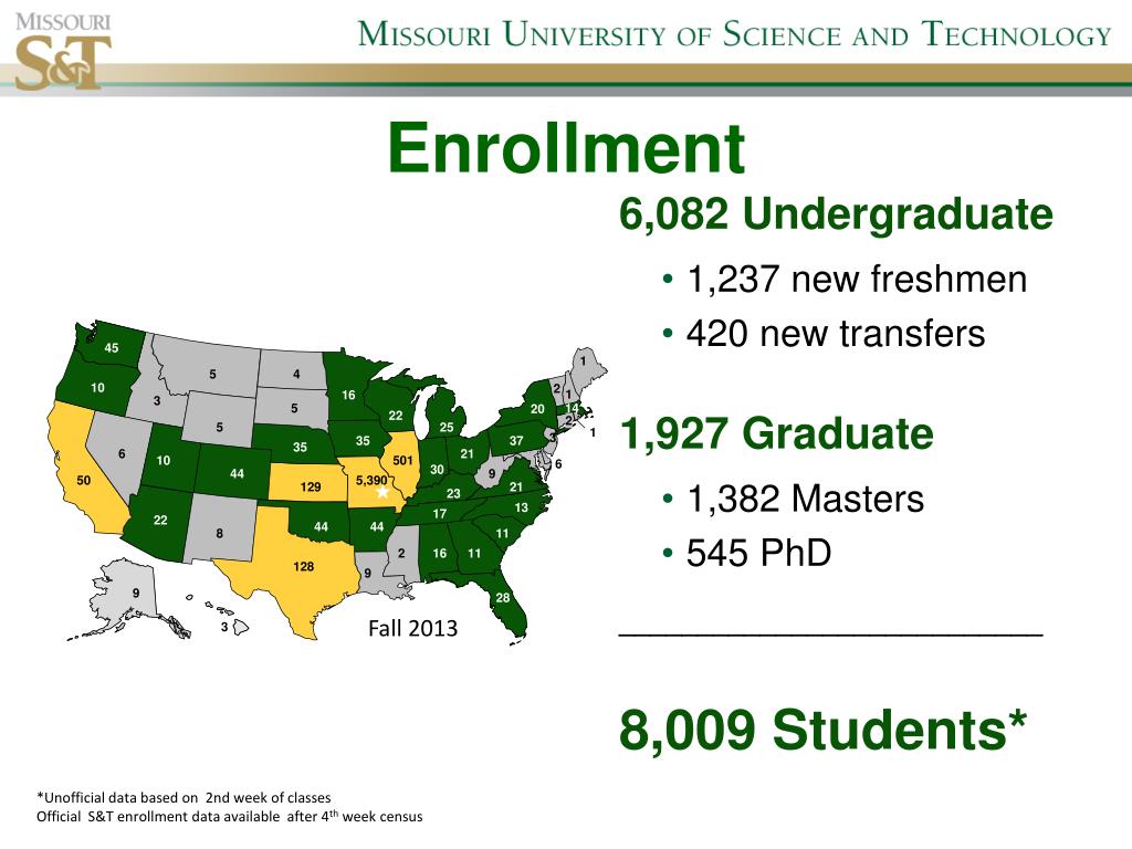Not Your “Average Joe” • Mid-range ACT: 26-31 • Average ACT: 27.9 • Average high school GPA: 3.80 • Average transfer credits: 14 hours • 57 National Merit Scholars* • 1,014 Bright Flight Scholars* • 1,671 Access Missouri Scholars* • 850 Curator’s Scholars* * Total of ALL students at S&T