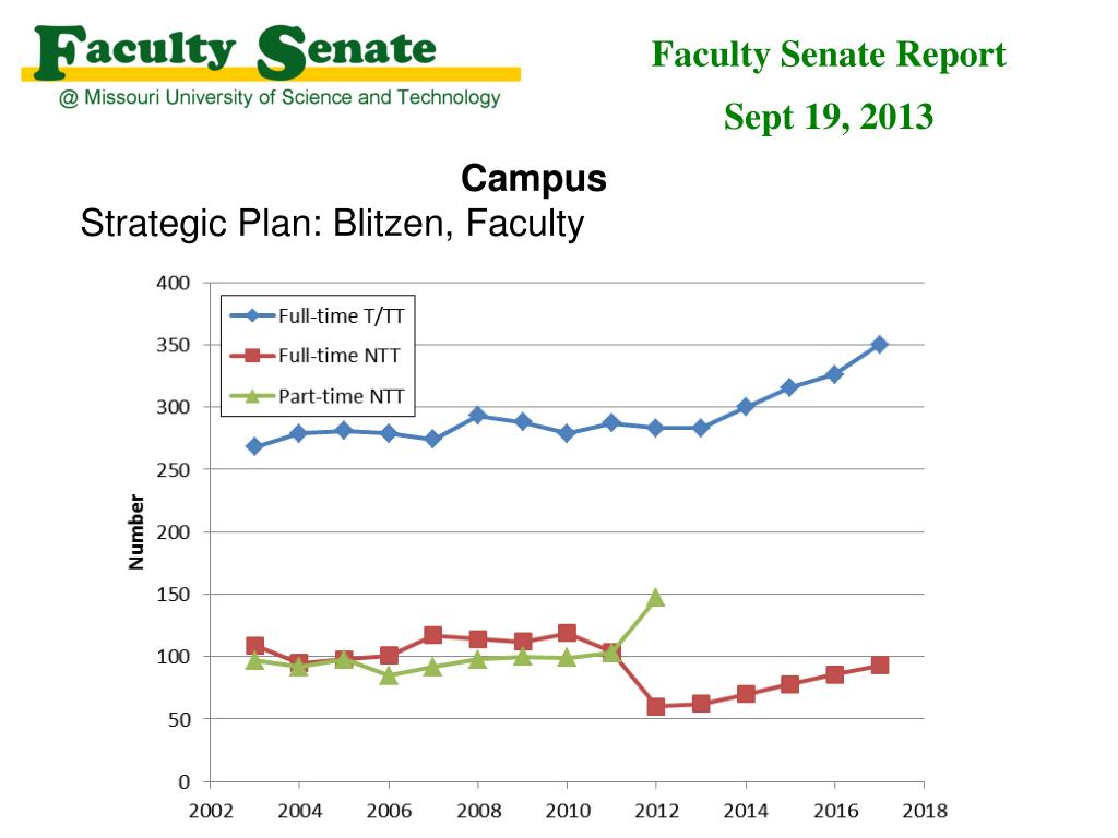Faculty Senate Report September 19, 2013 • Intercampus Faculty Council: NR, will meet next week • Board of Curators meeting: • $4.3 billion net assets (our retirement, endowments) remains healthy, 5.3% growth last year. • Promoting intellectual property, let companies own patents. S&T noted as good model, adopted last year. • $22.1 million in new strategic planning funds • + $48.5 million match (of which $25 million reallocated) • Will ask State for $1.2 million towards new Experimental Mine Building