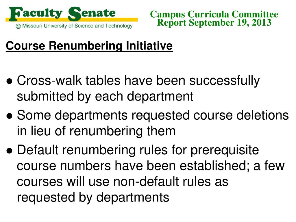 Campus Curricula Committee Report September 19, 2013 Course Renumbering Initiative • Cross-walk tables have been successfully submitted by each department • Some departments requested course deletions in lieu of renumbering them • Default renumbering rules for prerequisite course numbers have been established; a few courses will use non-default rules as requested by departments