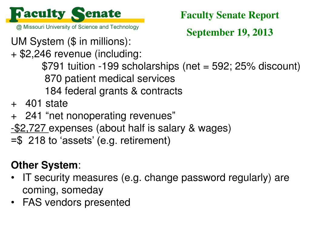 Faculty Senate Report September 19, 2013 • UM System ($ in millions): • + $2,246 revenue (including: • $791 tuition -199 scholarships (net = 592; 25% discount) • 870 patient medical services • 184 federal grants & contracts • + 401 state • + 241 “net nonoperating revenues” • -$2,727 expenses (about half is salary & wages) • =$ 218 to ‘assets’ (e.g. retirement) • Other System: • IT security measures (e.g. change password regularly) are coming, someday • FAS vendors presented