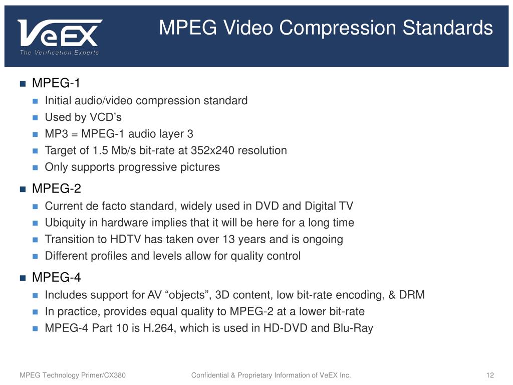 Agenda • Introduction to MPEG • Video Compression techniques • Compression standards • Frame Types and Structure • Program Specific Information • Digital Video Broadcast (DVB) • MPEG & DVB relationship • DVB Service Information (DVB-SI) • MPEG transport stream (TS) • Packetized Elementary Streams (PES) • MPEG clock mechanisms (PCR, PTS, DTS) • ETSI TR 101 290 test recommendation • CX380 CATV analyzer • Network Overview • MPEG Explorer option and video/audio metrics Confidential & Proprietary Information of VeEX Inc.