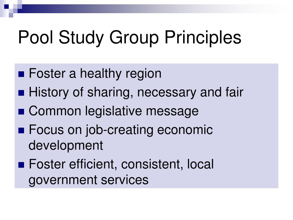 Pool Study Group Principles Foster a healthy region History of sharing, necessary and fair Common legislative message Focus on job-creating economic development Foster efficient, consistent, local government services