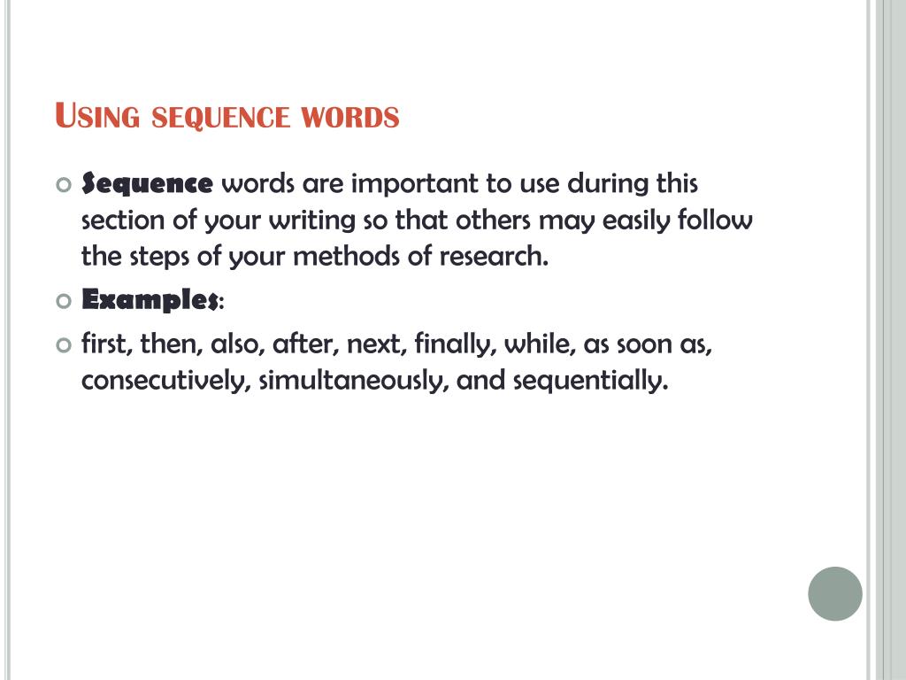 Using sequence words • Sequence words are important to use during this section of your writing so that others may easily follow the steps of your methods of research. • Examples: • first, then, also, after, next, finally, while, as soon as, consecutively, simultaneously, and sequentially.