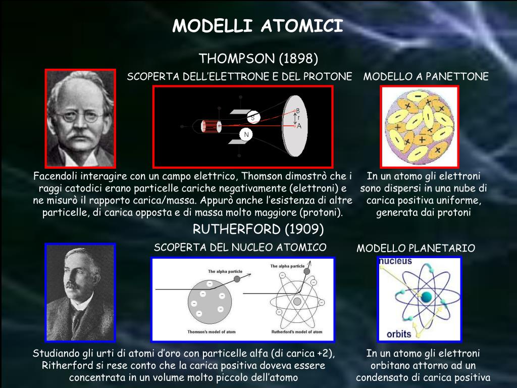 MODELLI ATOMICI THOMPSON (1898) SCOPERTA DELL’ELETTRONE E DEL PROTONE MODELLO A PANETTONE Facendoli interagire con un campo elettrico, Thomson dimostrò che i raggi catodici erano particelle cariche negativamente (elettroni) e ne misurò il rapporto carica/massa. Appurò anche l’esistenza di altre particelle, di carica opposta e di massa molto maggiore (protoni). In un atomo gli elettroni sono dispersi in una nube di carica positiva uniforme, generata dai protoni RUTHERFORD (1909) SCOPERTA DEL NUCLEO ATOMICO MODELLO PLANETARIO Studiando gli urti di atomi d’oro con particelle alfa (di carica +2), Ritherford si rese conto che la carica positiva doveva essere concentrata in un volume molto piccolo dell’atomo In un atomo gli elettroni orbitano attorno ad un condensato di carica positiva