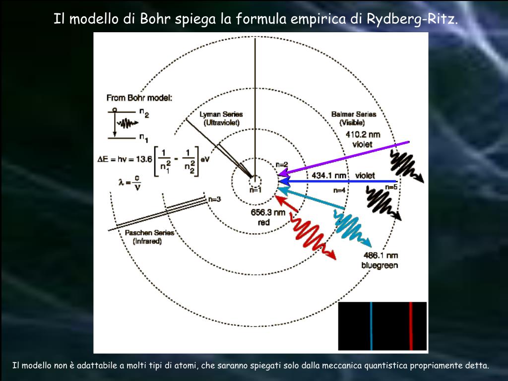 Il modello di Bohr spiega la formula empirica di Rydberg-Ritz. Il modello non è adattabile a molti tipi di atomi, che saranno spiegati solo dalla meccanica quantistica propriamente detta.