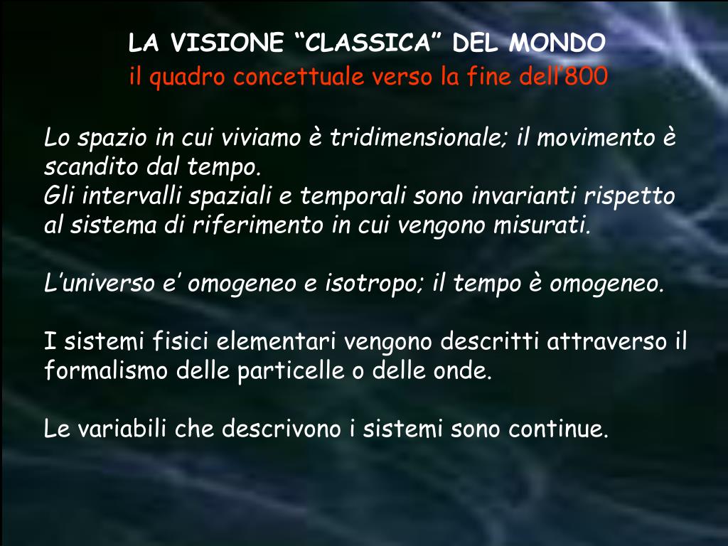 LA VISIONE “CLASSICA” DEL MONDO il quadro concettuale verso la fine dell’800 • Lo spazio in cui viviamo è tridimensionale; il movimento è scandito dal tempo. • Gli intervalli spaziali e temporali sono invarianti rispetto al sistema di riferimento in cui vengono misurati. • L’universo e’ omogeneo e isotropo; il tempo è omogeneo. • I sistemi fisici elementari vengono descritti attraverso il formalismo delle particelle o delle onde. • Le variabili che descrivono i sistemi sono continue.