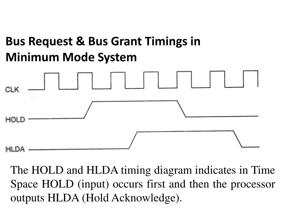 Bus Request & Bus Grant Timings in Minimum Mode System The HOLD and HLDA timing diagram indicates in Time Space HOLD (input) occurs first and then the processor outputs HLDA (Hold Acknowledge).
