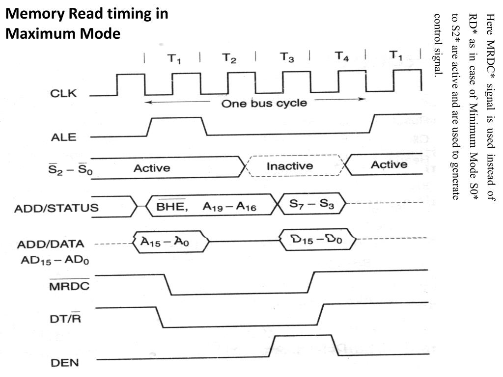 Memory Read timing in Maximum Mode Here MRDC* signal is used instead of RD* as in case of Minimum Mode S0* to S2* are active and are used to generate control signal.