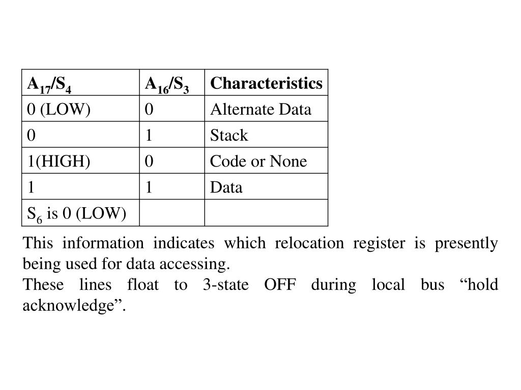 A19/S6, A18/S5, A17/S4, A16/S3 – Pin no. 35-38 – Type O Address / Status: During T1 these are the four most significant address lines for memory operations. During I/O operations these lines are low. During memory and I/O operations, status information is available on these lines during T2, T3, TW and T4. The status of the interrupt enable FLAG bit (S5) is updated at the beginning of each CLK cycle. A17/S4 and A16/S3 are encoded as shown. Continued…