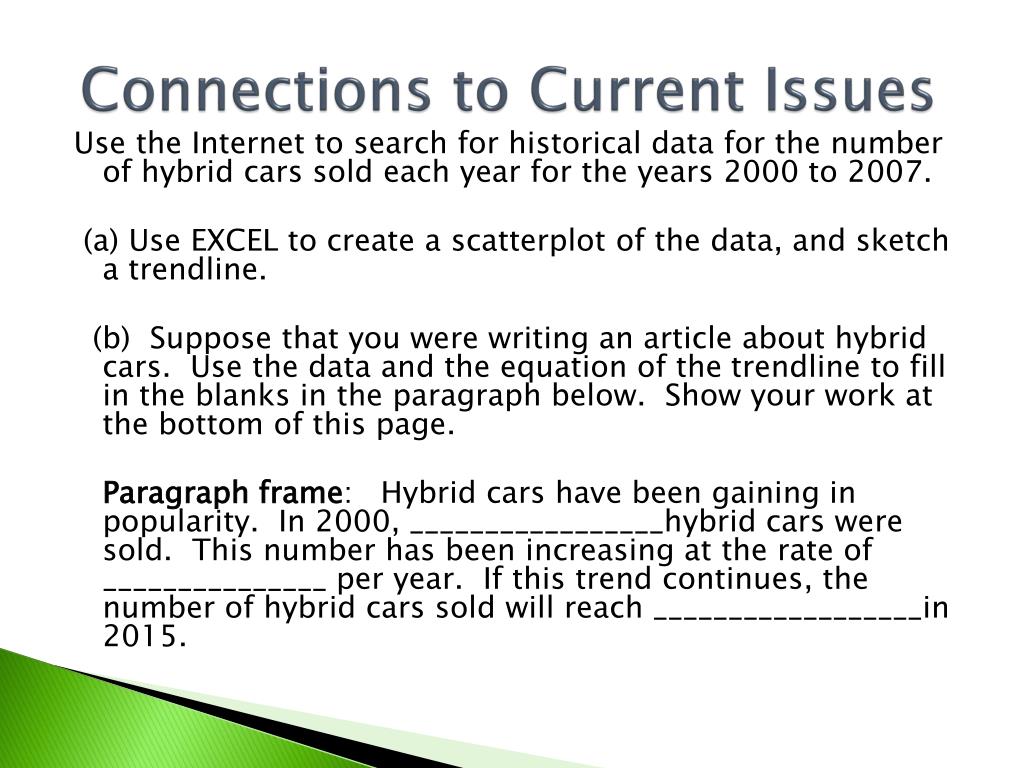 Connections to Current Issues Use the Internet to search for historical data for the number of hybrid cars sold each year for the years 2000 to 2007. (a) Use EXCEL to create a scatterplot of the data, and sketch a trendline. (b) Suppose that you were writing an article about hybrid cars. Use the data and the equation of the trendline to fill in the blanks in the paragraph below. Show your work at the bottom of this page. Paragraph frame: Hybrid cars have been gaining in popularity. In 2000, _________________hybrid cars were sold. This number has been increasing at the rate of _______________ per year. If this trend continues, the number of hybrid cars sold will reach __________________in 2015.