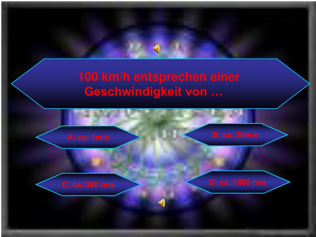 100 km/h entsprechen einer Geschwindigkeit von … B: ca. 30m/s A: ca. 1m/s D: ca. 1000 m/s C: ca. 360 m/s