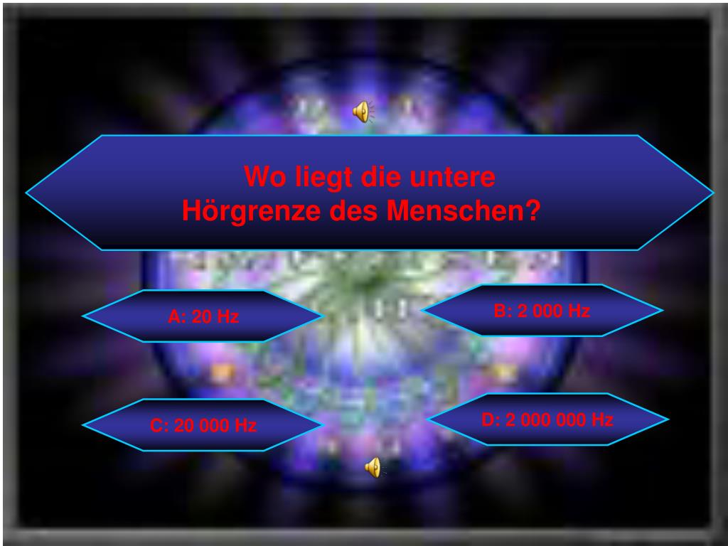 Wo liegt die untere Hörgrenze des Menschen? B: 2 000 Hz A: 20 Hz D: 2 000 000 Hz C: 20 000 Hz