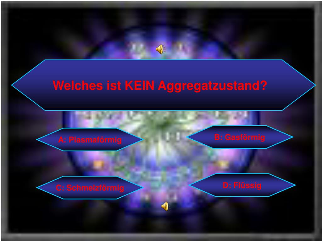 Welches ist KEIN Aggregatzustand? B: Gasförmig A: Plasmaförmig D: Flüssig C: Schmelzförmig